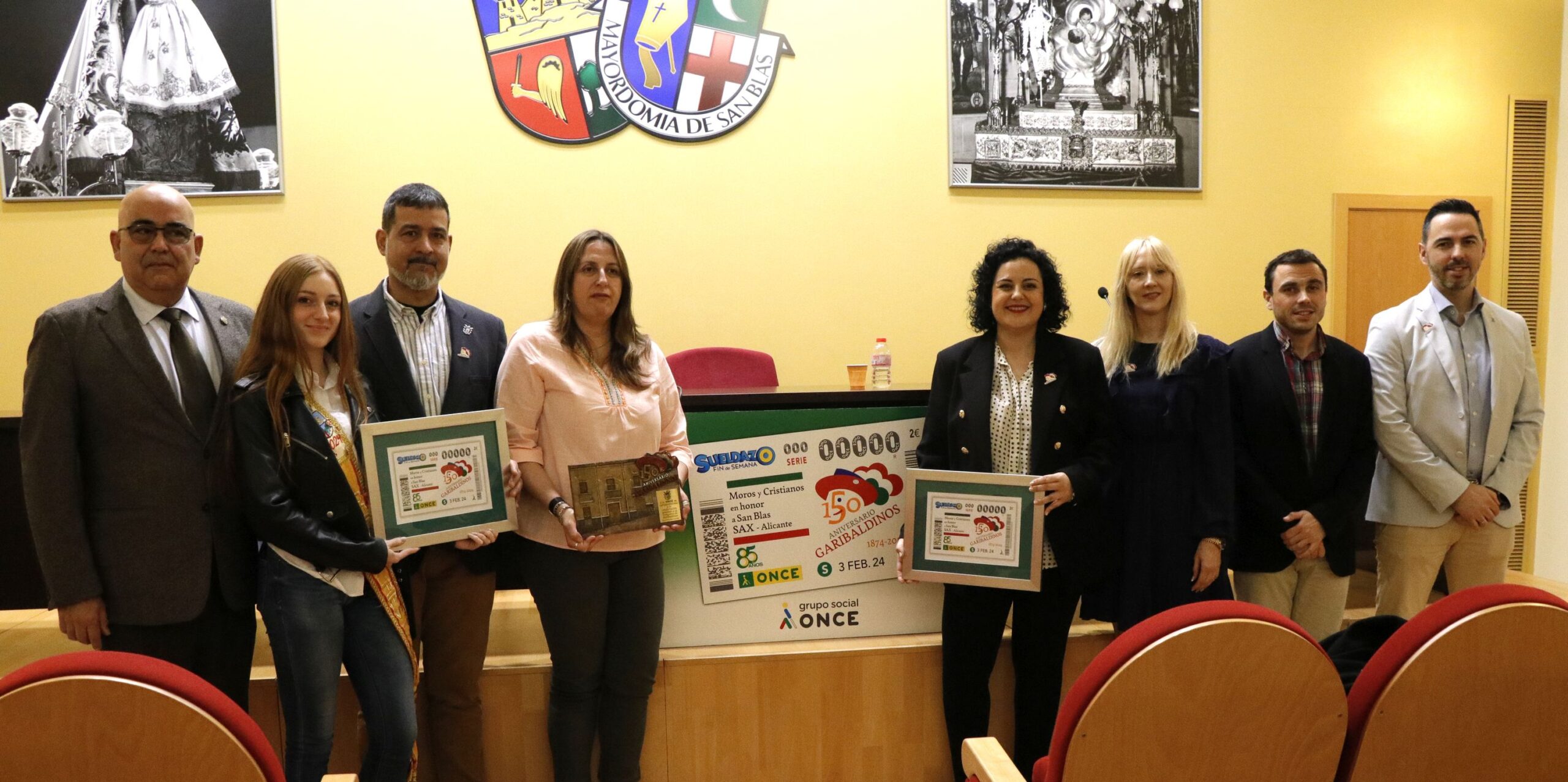 El lunes 29 de enero de 2024, a las 11:00 horas en el salón de actos de la Mayordomía de San Blas, se presentó el cupón de la ONCE que sería sorteado el 3 de febrero. El acto, de notable repercusión nacional, contó con la presencia de Estela Medina Peláez (directora de la ONCE en Alicante), Laura Estevan Antolín (alcaldesa de Sax), Francisco Sánchez Alarcón (presidente de la Mayordomía de San Blas) y José Vicente Antolín Compañ (presidente de la Comparsa de Garibaldinos). Como gesto simbólico, la comparsa adquirió todos los cupones correspondientes al número 01874, año de su fundación.