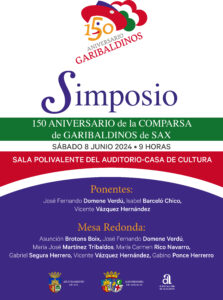 El sábado 8 de junio de 2024 se produjo uno de los actos intelectualmente más relevantes del aniversario: un simposio sobre la historia, orígenes y evolución de la Comparsa de Garibaldinos. El encuentro tuvo lugar en la Sala Polivalente del Auditorio-Casa de Cultura de Sax y se prolongó durante toda la mañana.