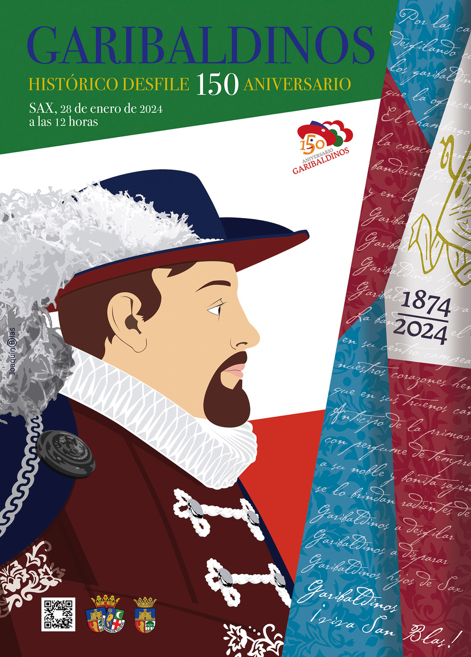 Cartel anunciador del desfile del 150 Aniversario de la Comparsa de Garibaldinos de Sax que tendrá lugar el próximo domingo 28 de enero de 2024 a las 12:00 horas.